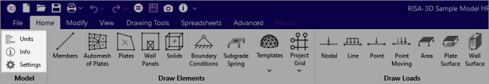 The model settings may be accessed on the Home ribbon in the Model section. The settings consist of three main options (Units, Info and Settings) that are highlighted in the following image.