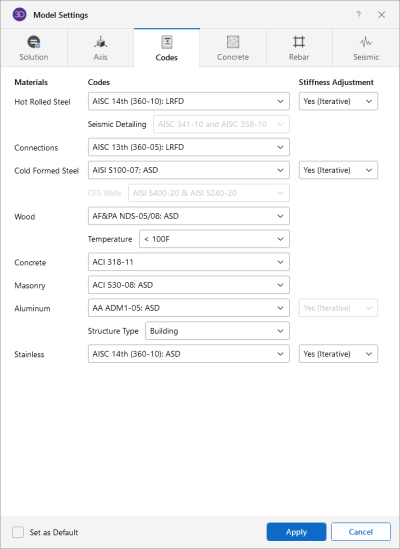 The settings under the Codes tab control which design code is used for code checks for each material type.