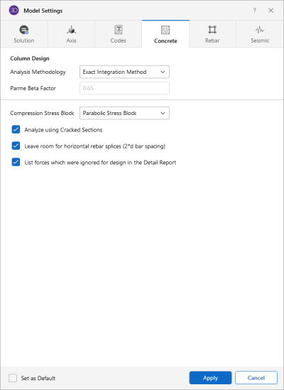 Analysis Methodology controls which method is used to determine the biaxial column capacity. The options are the PCA Load Contour Method and the Exact Integration Method.