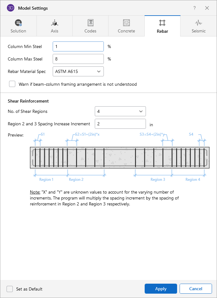 Shear Reinforcement Options lets you control the Number of Shear Regions that is used when detailing a beam or column span. You can also specify a Region 2 & 3 Spacing Increase Increment that you'd like the program to use when increasing or reducing the spacing of the shear ties.