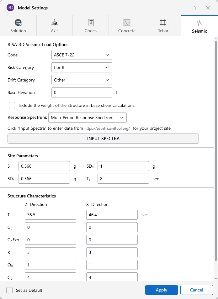 The options on the Seismic tab list settings that are specifically related to calculation of code prescribed Seismic Loads. This information can be used by RISA-3D to automatically generate the Lateral Loading on your structure. Depending on which Seismic Code you select will depend on the input options that you have.