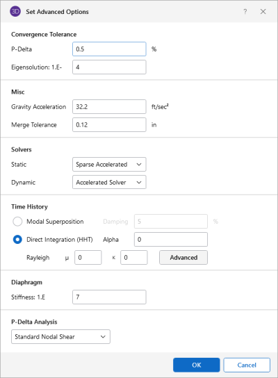P-Delta Convergence Tolerance is used to adjust the tolerance used to determine convergence of the P-Delta analysis. Be sure to enter this value as a percentage! The default for this is ½ of 1 percent (.5%). See P-Delta Analysis to learn more about this.