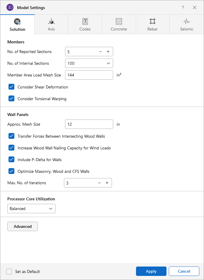 The Solution tab is the first tab in the Model Settings window. The entries on this tab are used to control settings that affect the general solution of the model (Members, Wall Panels, Processor Core utilization and Advanced).