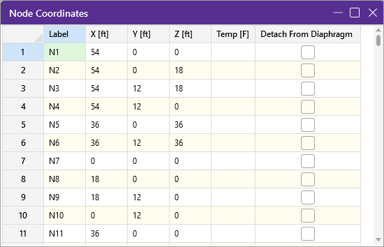 These three columns contain the coordinates of the node in each of the global directions. These represent the relative offsets of the nodes from the origin of the coordinate system (0, 0, 0). The appropriate units are listed at the top of each column. |