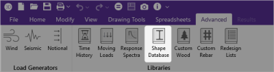 Manufacturer and custom cold formed shapes are accessed by clicking the Shape Database icon  from the Advanced ribbon and then clicking the Cold Formed tab from the Shape Database Editor window.