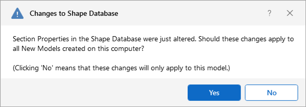 After editing the geometric or section properties for a shape in your model, you will be prompted with this Changes to Shape Database dialog. Click 'Yes' if you want to add the shape modifications to your Shape Database to be available for all future models. Click 'No' if you do not want the changes to apply to other models, this will not save the changes in the Shape Database for other models.