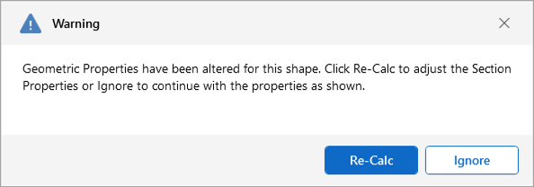 You can also make edits to the geometric and section properties of the shapes in your Shape Database. If you modify geometric properties, you can also use the Re-Calc button for the program to automatically calculate the corresponding section properties.