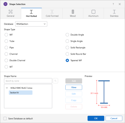 Note: Currently, RISASection can only import General and Hot Rolled Steel shapes. More material choices will be available in a future version.