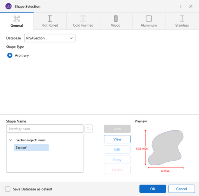 The shapes that are designated as General Material, Arbitrary Shape Type in RISASection will show up in the General tab under the "RISASection" Database.