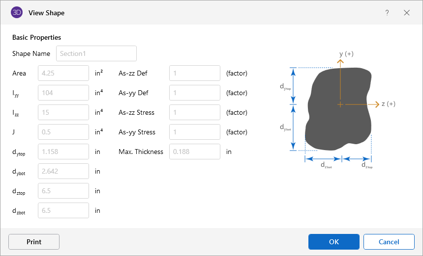 AISC code checks are not calculated for arbitrary shapes since their place in the specification is unknown. Everything else will be calculated for them (forces, deflections, stresses). The max thickness (Max thick) value for the cross section is used to determine the pure torsional shear stress for the shape. "J" is the torsional constant. The "d" values (the distances to the extreme fibers) allow the program to calculate stresses at the extreme fibers.