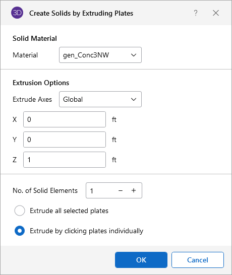 The “Create Solids by Extruding Plates” window lets you take any existing plate and extrude it out into a three dimensional object.
