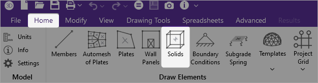 Solid Elements are not drawn in RISA-3D. Instead, they must be extruded from a mesh of plate elements. Use the Insert menus or the Drawing Toolbar to create new solids. Once you have created these items, you can use other graphic features to load the model and set boundary conditions.