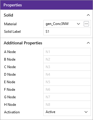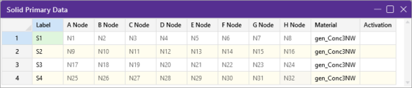 The A, B, C, D, E, F, G, and H node entries are used to define the 8 corner nodes of the solid element. These nodes are unable to be edited in the spreadsheet, since solids are created by extruding existing plates. |