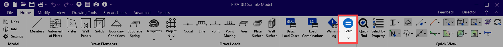 Four solution options are presented when you click Solve on the menu. Some of the options require other solution types to be performed. See Results for information on solution results. For additional information on Dynamic Analysis and Response Spectra Analysis results refer directly to those sections. For connection design within RISA-3D see the RISAConnection Integration topic.