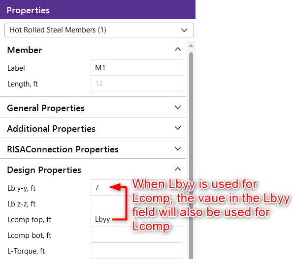 When this beam is brought into RISA-3D, the RISA-3D member properties show that Lcomp-bot is referencing RISAFloor (Floor).