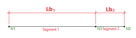 When this command is used, all Nodes which fall along the length of the physical member are assumed to provide bracing. If Nodes are not evenly spaced along the member then an unbraced length is calculated for each "segment". A segment is defined as the distance between adjacent Nodes. In the example below, the member is defined as one physical member spanning from N1 to N2. The intermediate node N3 is considered as a brace point when Segment is specified for this member. Therefore the forces which occur in Segment 1 will be compared against a capacity calculated using Lb1, and the forces occurring in Segment 2 will be compared against a capacity calculated using Lb2.