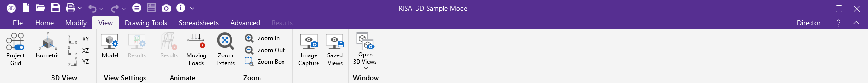 The View ribbon offers various tools to change the model view, display of loads and results, and active windows.