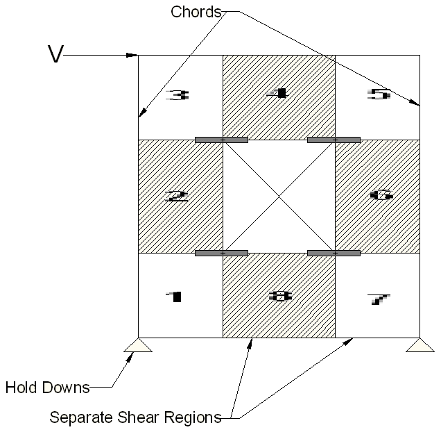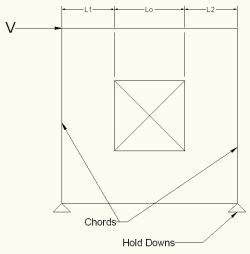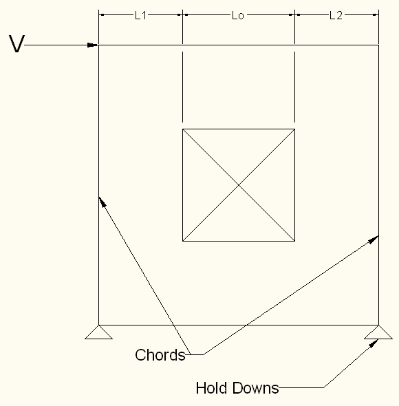 Where there is a wall panel with openings, the area above and below the openings is disregarded and the wall is designed as being made up of separate, smaller shear walls.