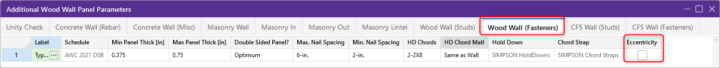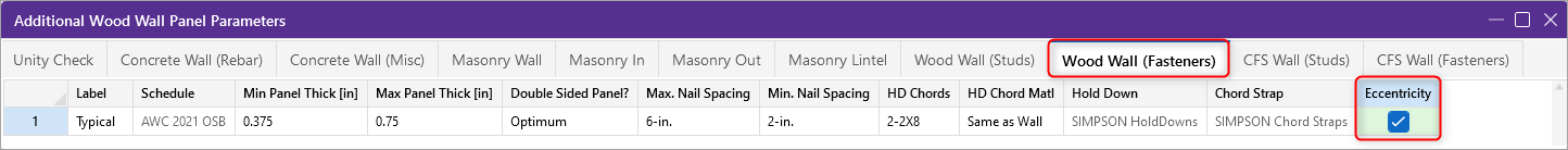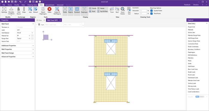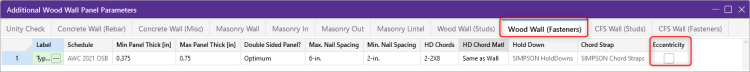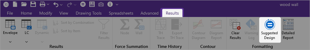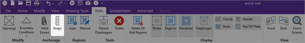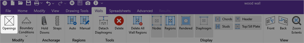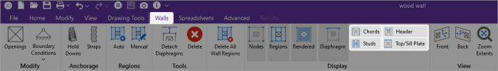 The Walls ribbon provides specific information and options for the modeling/analysis of wood walls.