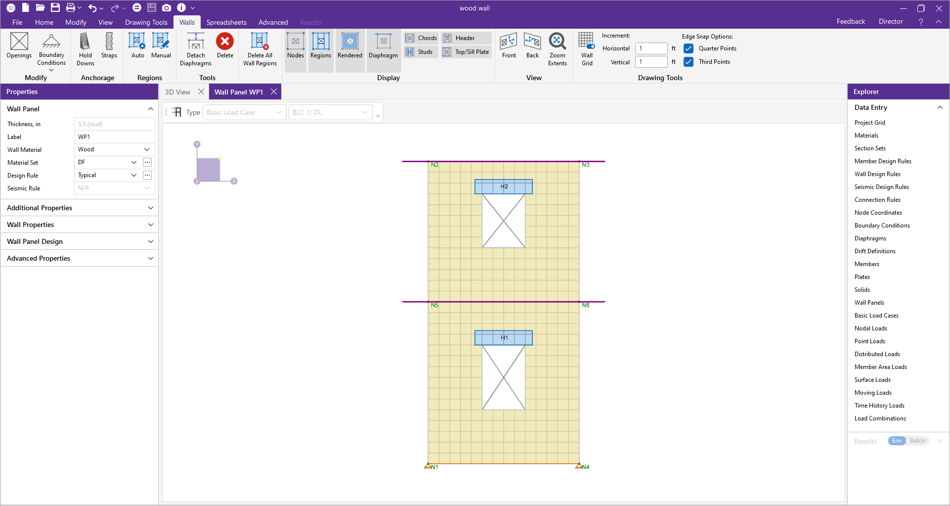 1. Model the entire building (gravity and lateral members) within RISAFloor. Be sure to model all openings and regions for all of the wall panels in the model.