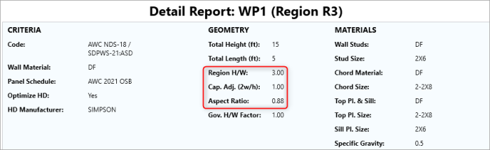 For Segmented and FTAO wall panels designed per the NDS 2015, the program also checks the Aspect Ratio factor per section 4.3.4.2. This factor will reduce the sheathing capacity for lateral (Wind or Seismic) load combinations on walls who have a design region whose aspect ratio is greater than 2.0. This is called "Aspect Ratio" in the detailed report output.