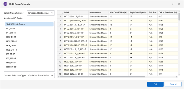 The procedure that RISA uses for hold-down optimization is fundamentally based upon the assumption that there is a 'cost' to allowable tension in a product, and therefore the ideal hold-down would have as little tensile capacity as possible to meet code requirements. Once the program has determined the tensile force required to hold-down the wall it will choose the most economical hold-down product based on that which most closely matches (but does not exceed) the tension demand. The program looks to the Allowable Tension field of the hold-down schedule to choose the design.