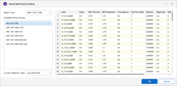 The default shear panels in the program come straight from published tables in the IBC, UBC, and CSA O86 design manuals. "St-I" refers to Structural I panels and "RS" refers to Rated Sheathing panels.