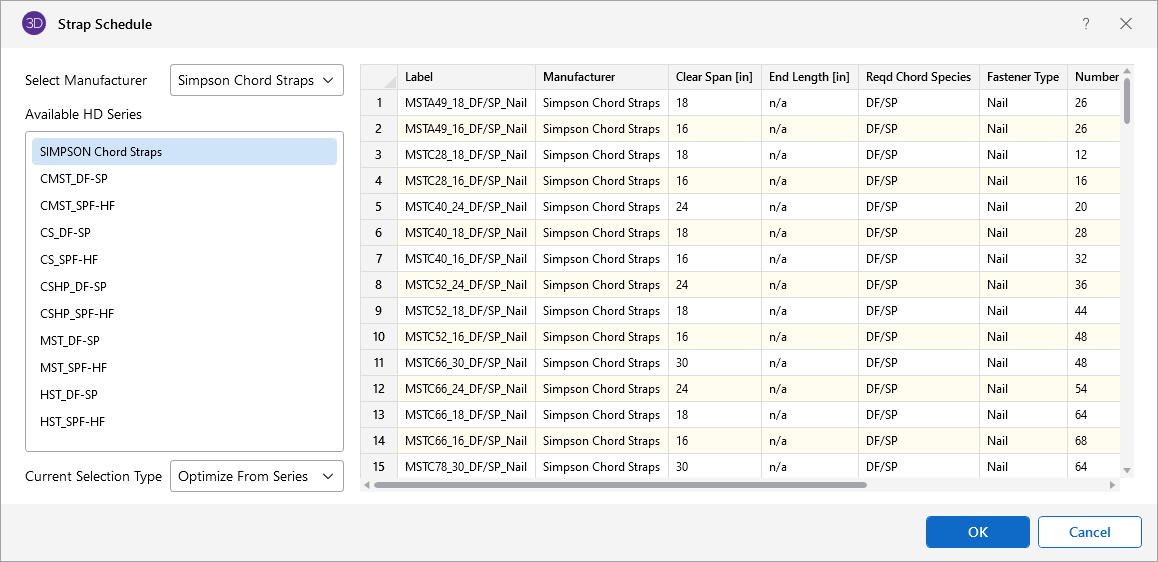 For users who are new to wood wall design within RISA, the best procedure is to utilize the full databases, and to limit the potential designs by utilizing the design rules spreadsheets. This results in a design based on the maximum number of options, which is often the most efficient design.