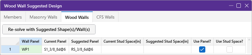 In the Suggested Design spreadsheet you will get a list of wall panels in your model that are not yet fully optimized, showing the panel and stud spacing of the last iteration and the program optimized values. From here you have the ability to Use Panel? or Use Stud Space? which means that you want to re-run the solution with the suggested design. You can choose this for each suggestion for each wall panel individually. Once you have these checkboxes checked appropriately click the Suggested Design icon in the Results tab to re-solve the model with the suggested design. After this the stiffness matrix is re-formulated and may cause some redistribution of loads through the model. Because of this the suggested design may also update and you may need to Use Panel?and/or Use Stud Space? multiple times to converge on a solution.