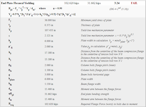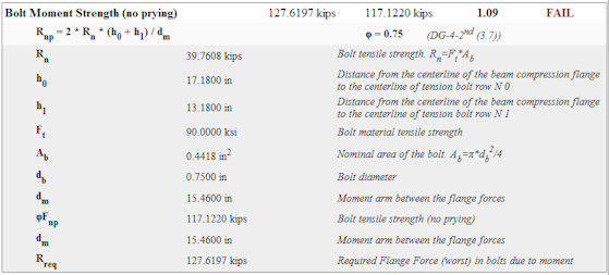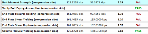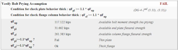 For 8 bolt moment connections, if either these checks fail, then the no prying assumption is not valid. Thus, the connection will be said to "fail". IN reality, it may work fine, but the user would have to demonstrate how to manually consider prying for the bolt tension checks.
