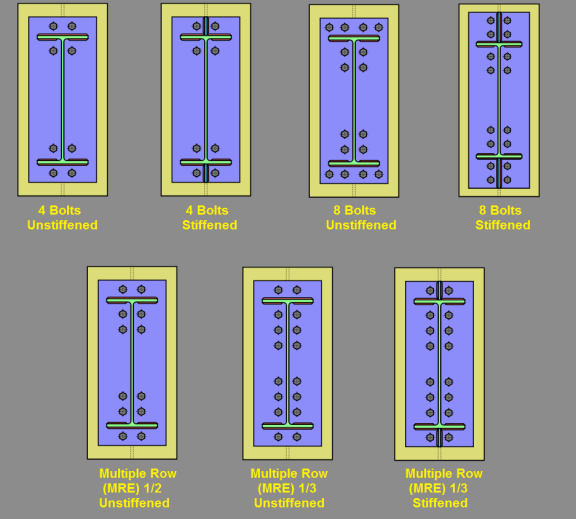 Currently the program can model any type of end plate connections described in the AISC design guides, plus an 8 bolt extended connection not specifically described in the design guides. The yield lines for this "8 Bolt (unstiffened)" connection are taken from Emmet Sumner's PhD thesis ("Unified Design of Extended End- Plate Moment Connections Subject to Cyclic Loading" June 17, 2003) which forms much of the basis for Design Guides 4 and 16. Specifically refer to the MRE 1/2 connection in this paper (section 4.4.4.7 and Figure 4.9) for the end plate yield lines. Similarly refer to the MRE 1/3 connections in Figures 4.10 and 4.11 for the end plate yield lines of the unstiffened and stiffened connections, respectively.