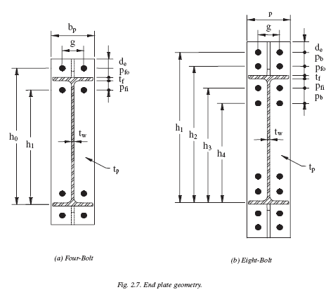 These checks are specific only to end plate moment connections. There are several checks for plate failure in an end-plate moment connection. These checks are outlined below. All design procedures and equation references, unless otherwise noted, are taken from AISC Design Guide #4, 2nd Edition. In cases where bolt prying may affect the design, the prying effects are calculated per the procedure in AISC Design Guide #16.