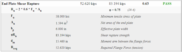 The Bolt Moment Strength check varies depending on whether there is prying force action or not. Therefore, the program reports this section to show the calculations which determined what Bolt Moment Strength check was used.