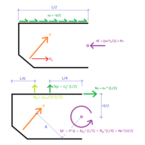 The shear (V'), axial force (N'), and in-plane moment (M') at section b-b are calculated using the method of sections (statics). The derivations are shown below.