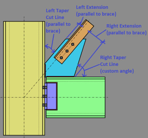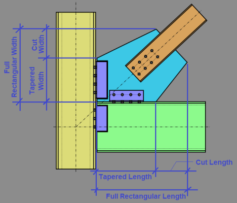 Gusset plates for Vertical Diagonal Braces and Knee Braces can be rectangular or have tapered edges. There are two ways to model a tapered gusset plate: Cut Back or Custom Angle.