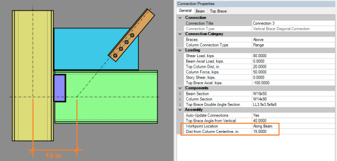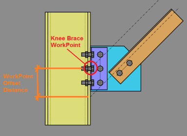Because a Knee Brace frames into a beam or a column, not both, there is no beam to column intersecting work-point. Therefore, we consider the work-point to be the brace center-line intersection with the centroid of the gusset to beam (or column) connection.