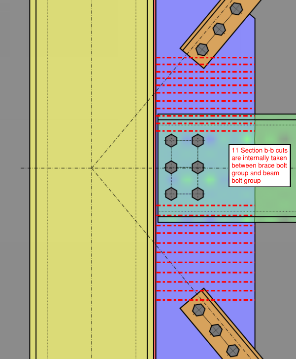 For each extended shear tab without gusset connection, the critical section is assumed to occur outside of the beam bolt groups and somewhere in between the beam bolt group and brace (upper or lower). 11 equidistance section cuts are taken between the extents of the beam bolt groups and braces (i.e. 22 section cuts in total for the case where there are top and bottom braces). The results are then only reported for the critical section, that is, the section producing the highest unity check.