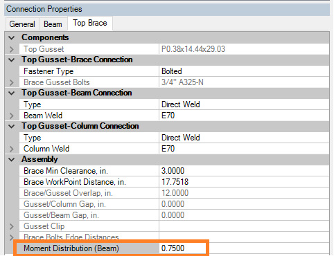 RISAConnection is not capable of determining how much of this moment is taken by the beam or the column, as that is a function of the rigidities of the gusset-beam connection and the gusset-column connection, respectively. This distribution is determined by a Moment Distribution Factor, which is user-entered in the Assembly properties on the Brace tab.