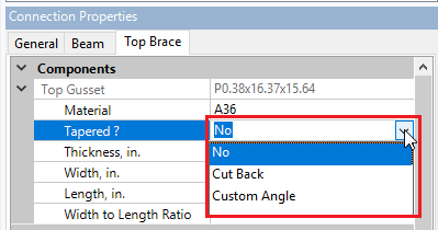 Under the Brace tab(s) on the Connection Properties grid, you can expand the Gusset section to set your desired Width to Length Ratio. The available options are shown below and your selection controls if your sub-connections will be designed for moment forces or not. The details for these options are shown below.