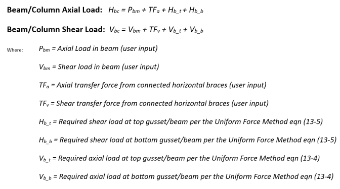 Traditionally, the Uniform Force Method (and the Unlimited Method) has calculated the required shear and axial forces using the simplified (2D assumption) equations on the middle of page 13-5 of the AISC 14th edition Steel Design Manual. RISAConnection extrapolates this using simple statics to also include the Axial Transfer Load and the Shear Transfer Load. The axial transfer force is defined as the component (in plane of the connection) from the connected horizontal braces. The Shear Transfer Force is defined as the required shear force from connected horizontal braces.
