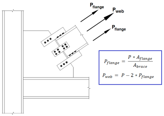 When a brace member is defined as a Wide Flange, it will connect to the gusset plate using claw (clip) angles. Because of the complexity of the brace to gusset connection, it is no longer appropriate to assume that the axial load is applied along the centerline of the brace. Instead, the load on the gusset plate is proportional to the cross sectional area of the connection element. This design methodology comes from Example II.C-2 from the AISC Design Examples Version 14.1.