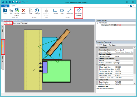 RISAConnection includes toggle buttons to view the Whitmore Section and unbraced length. These are available on the 2D Side View graphical view for vertical brace connections.