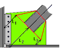 For compression, the gusset plate code check requires that Whitmore Section be viewed as an equivalent column. The width of the column is merely the width of the Whitmore section as discussed above. However, the compression checks also require an equivalent unbraced length KL for buckling checks. Currently the unbraced length used for the gusset compression checks is the unbraced length at the center of the Whitmore section (L2 as shown in the image below).