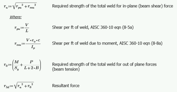 This resultant stress is compared against the fillet weld strength per AISC Specification equation J2-4, conservatively assuming a load angle (θ) of zero.