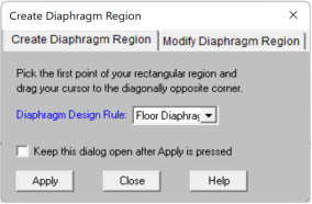 Diaphragm Regions are used for explicitly defining load attribution, and for wood diaphragm design. They are not required for flexible diaphragm analysis. To draw a diaphragm region, click on the button on the graphic editing toolbar.