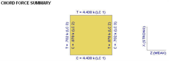 The chord force summary gives an overall view of the chords on all sides of the diaphragm design region. The chord force calculation is simply the calculated moment divided by the length of the diaphragm (M/L). As the diagram above shows, we will give both tension and compression maximum values, if there are both tension and compression forces for the solved load combinations. The global axes are shown as a reference.