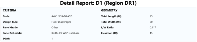 In addition the basic geometry information for the diaphragm (Total Length, Total Width, Elevation, and L/W Ratio) are also reported here.