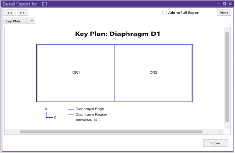 The diaphragm key plan is just a plan view of the diaphragms at a given level. The key plan can be accessed by clicking the Detail Report button then click on the Flexible Diaphragm perimeter. This opens the Diaphragm Detail Key Plan, from which a diaphragm region can be chosen by clicking to review its results.