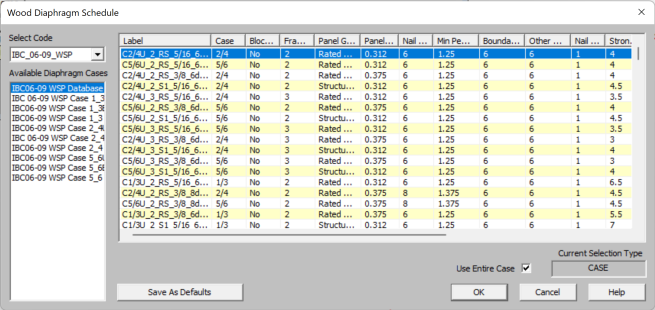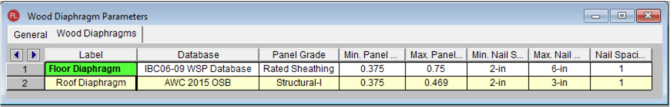 Within the Wood Diaphragm Schedule dialog, you can select between oriented strand board (OSB) or wood structural panels (WSP) databases (plywood or OSB), which have values that are pulled directly from the 2006 IBC. You are also allowed to select between design groups based on cases and whether the diaphragm is blocked or not. You may also specify exact diaphragm parameters by selecting "Use Individual" in the Current Selection Type. For more information on this database, as well as information on how to edit or create your own custom database, see Appendix F-Wood Design Databases