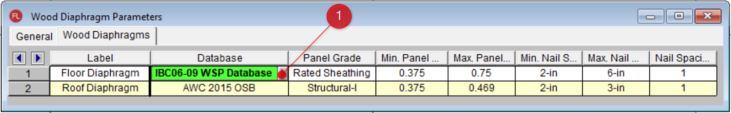 The program will use your min/max panel thickness and nail spacing to choose an appropriate nailing and panel layout from the Database chosen. The database options can be viewed by clicking the red arrow in the Database column.